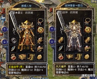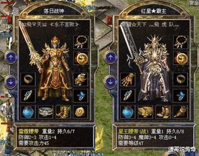 再看看英雄的穿搭对比:红星霸主英雄身披王者战甲,手持攻47开天,高端装备有王者护腕,王者战戒,麻痹戒指,星王腰带,狂雷战靴,王者斗笠,王者勋章,神威手镯,至于头盔被盖住了就不说了。加点装备是幸运战神项链,档次确实高端。落日战神英雄的穿搭乍一看剑甲不如前者,但是一看属性才发现错了,除了攻47开头以外,他的凤天魔甲是攻6的炸裂属性。除了幸运战神项链以外,其他是狂雷套装搭配王者勋章和麻痹戒指,伤害吸收效果杠杠的,整体档次丝毫不落下风。综合对比二人同期的穿搭来看,他们都是当时的巅峰战力代表,而天龙圣剑的出现让落日战神的地位更胜一筹,确实牛掰。